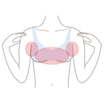 バスト全体とブラのハミ肉までマックスボディを出し、肩甲骨を回す(乳頭は避ける)※手を肩にのせて、肘と肘をくっつけるイメージで胸を大きく広げて円を描く